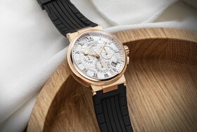宝玑Marine航海系列在承袭航海风格的同时, 巧妙融入现代风格,无论是搭配丹宁服饰还是典雅礼服, 皆可轻松驾驭。